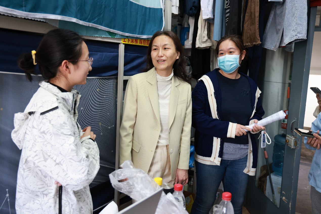 2023年4月14日下午,性爱视频 直属党支部书记蒙彬、书院团委书记许艳艳、书院团委副书记叶然和各班班主任来到宿舍与同学们亲切交流。