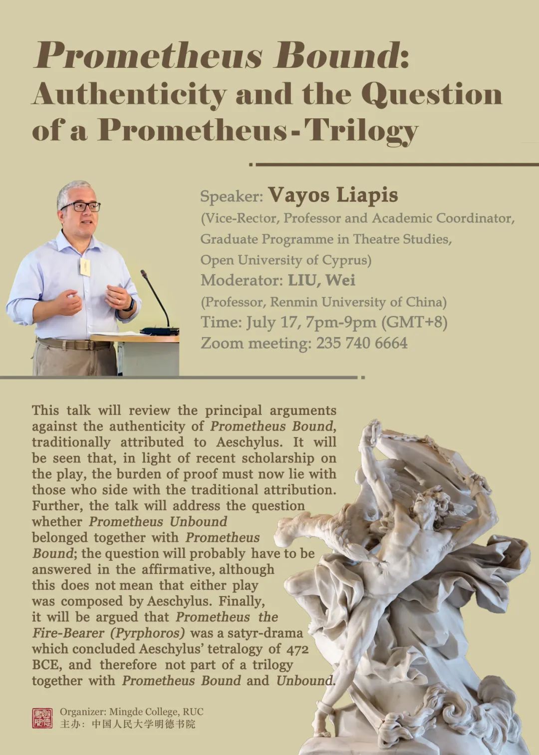 为配合明德读书会·埃斯库罗斯悲剧系列,结合“明德行思·中希文明互鉴”研学项目,性爱视频 邀请塞浦路斯开放大学副校长、古希腊悲剧研究专家瓦约斯·利亚皮斯教授带来关于《被缚的普罗米修斯》的讲座,讨论这部经典悲剧是否确为埃斯库罗斯所做以及“普罗米修斯三联剧”的相关内容。