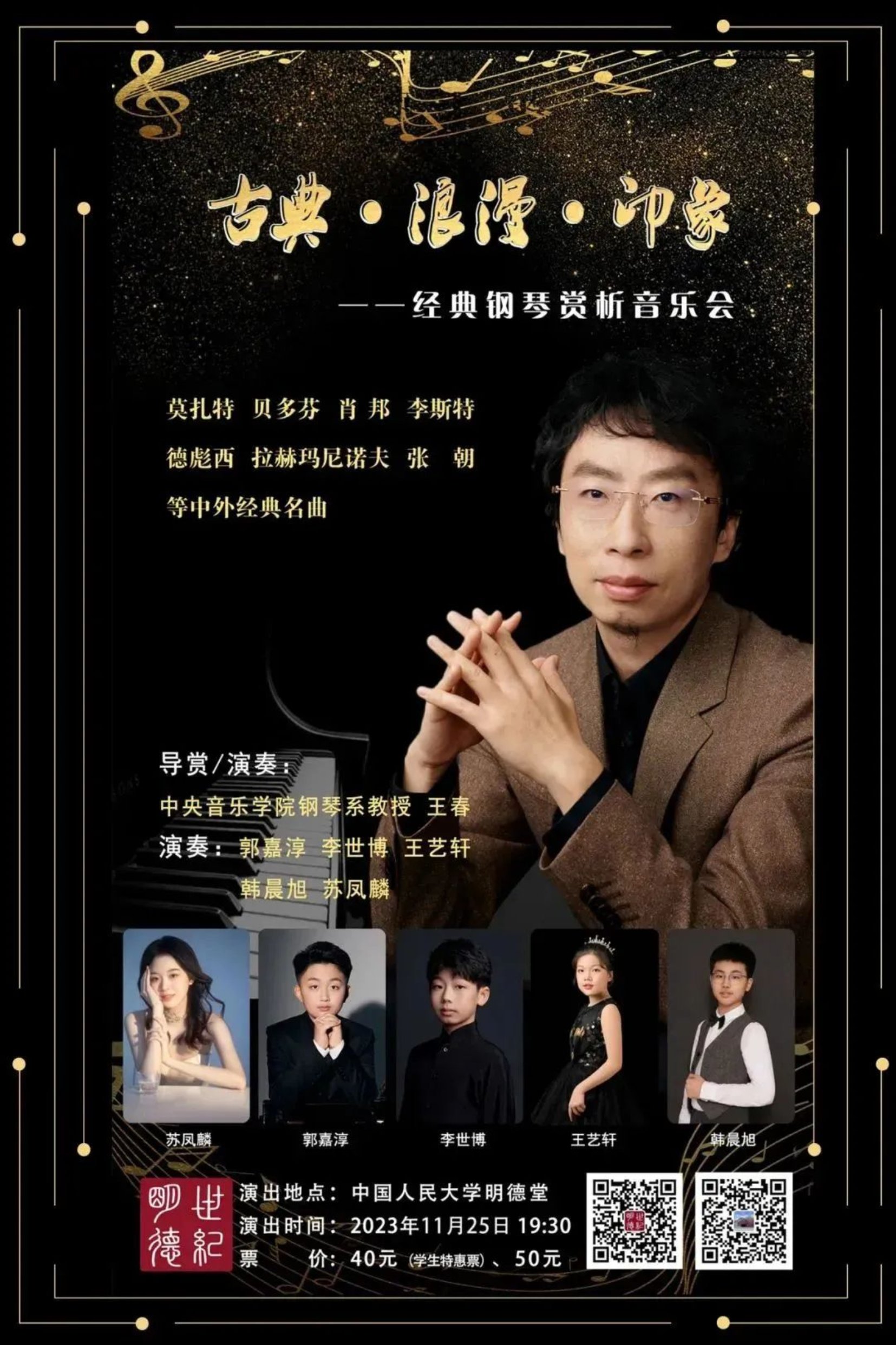 11月25日晚,来自中央音乐学院的著名钢琴家王春教授将与他的优秀学子一起在中国人民大学明德堂为大家献上一场内容丰富、精彩纷呈的音乐会。