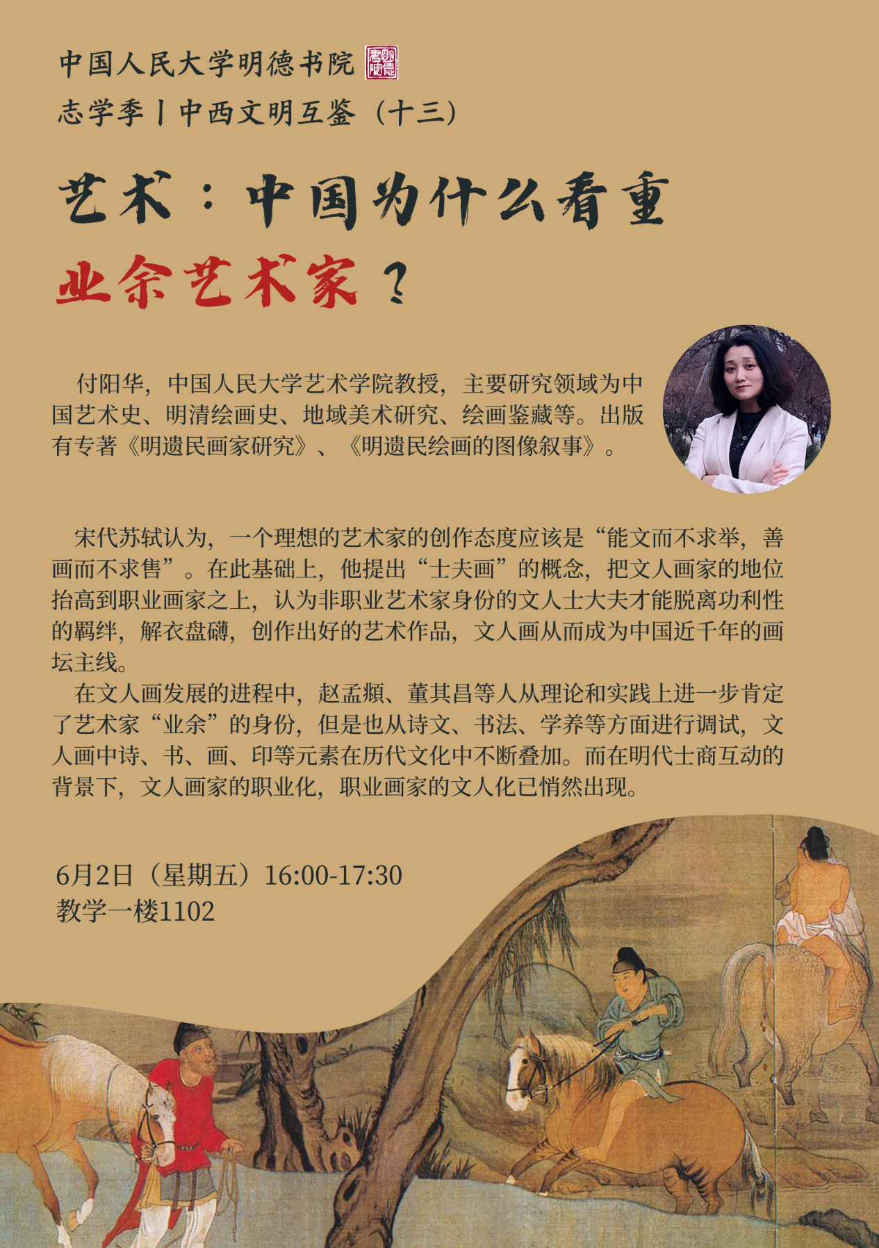 付阳华,中国人民大学艺术学院教授,主要研究领域为中国艺术史、明清绘画史、地域美术研究、绘画鉴藏等。出版有专著《明遗民画家研究》、《明遗民绘画的图像叙事》。
