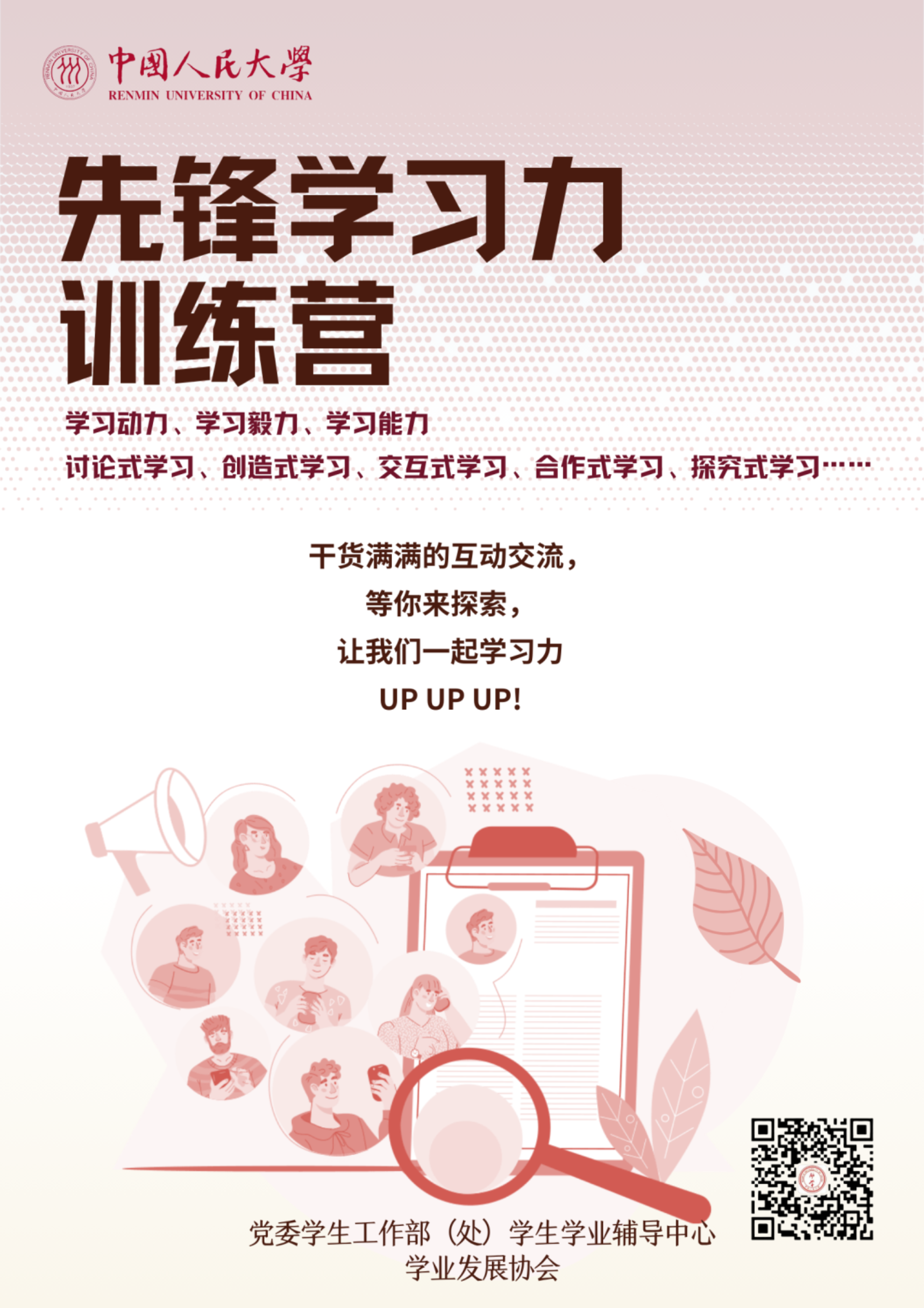 本学期第一周学业咨询预约即日开启,请扫描下方二维码,即可进入预约界面,同学们可以自主预约心仪的学业咨询师。预约过程中,如有疑问,可以联系党委学生工作部(处)学生学业辅导中心,工作电话15929804595、13810647308。后续咨询预约信息,请及时关注“励学人大”微信公众号。我们将定期发布学业咨询排班表,全过程支持同学们的发展成长。