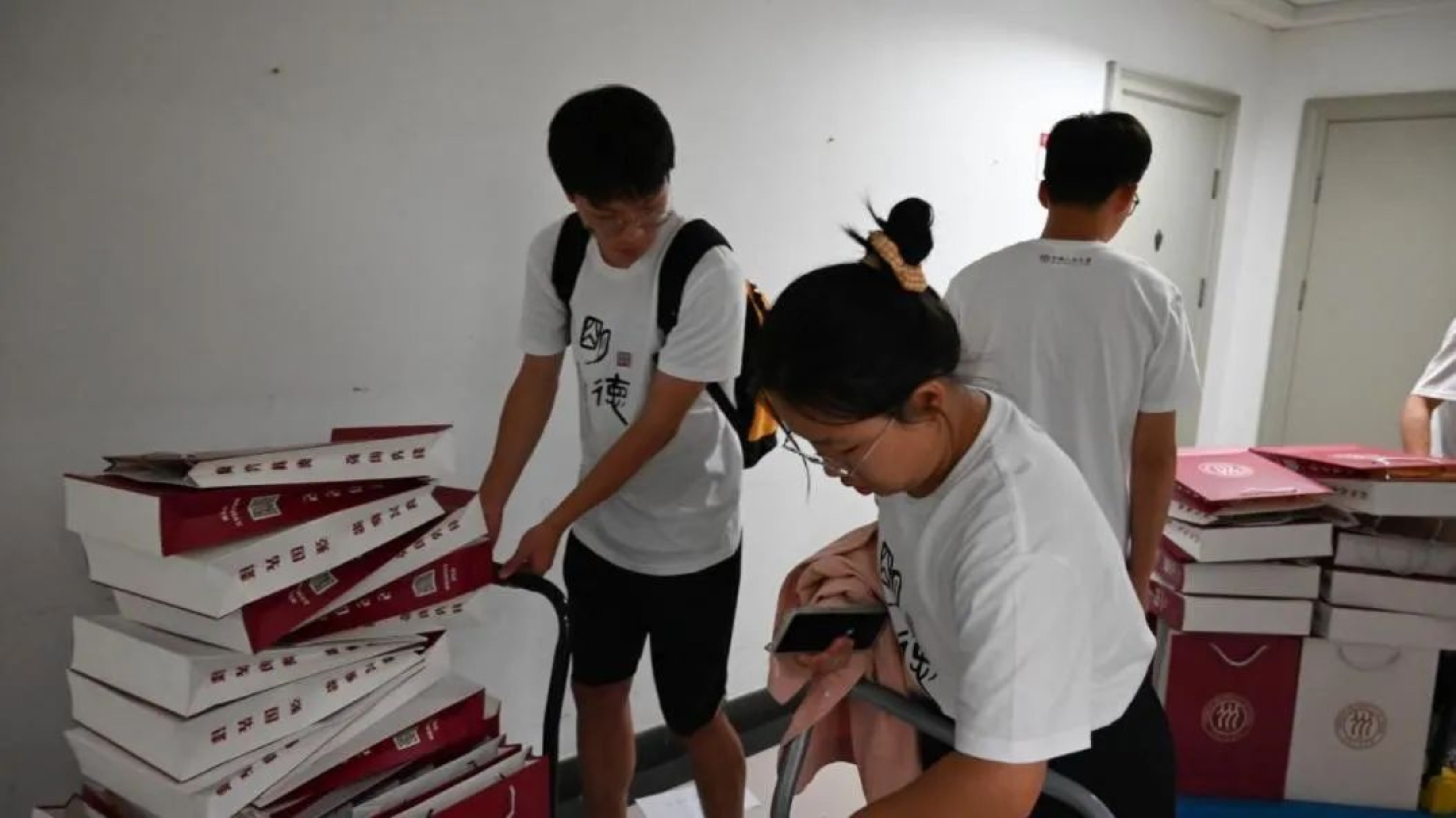 书院学长组一对一联系新生,陪伴完成报到、注册、住宿等入学程序,各班辅导员认真核对报到材料,为新同学送上书院定制的帆布袋、院衫和入学材料,新生入学手续有条不紊地进行着。