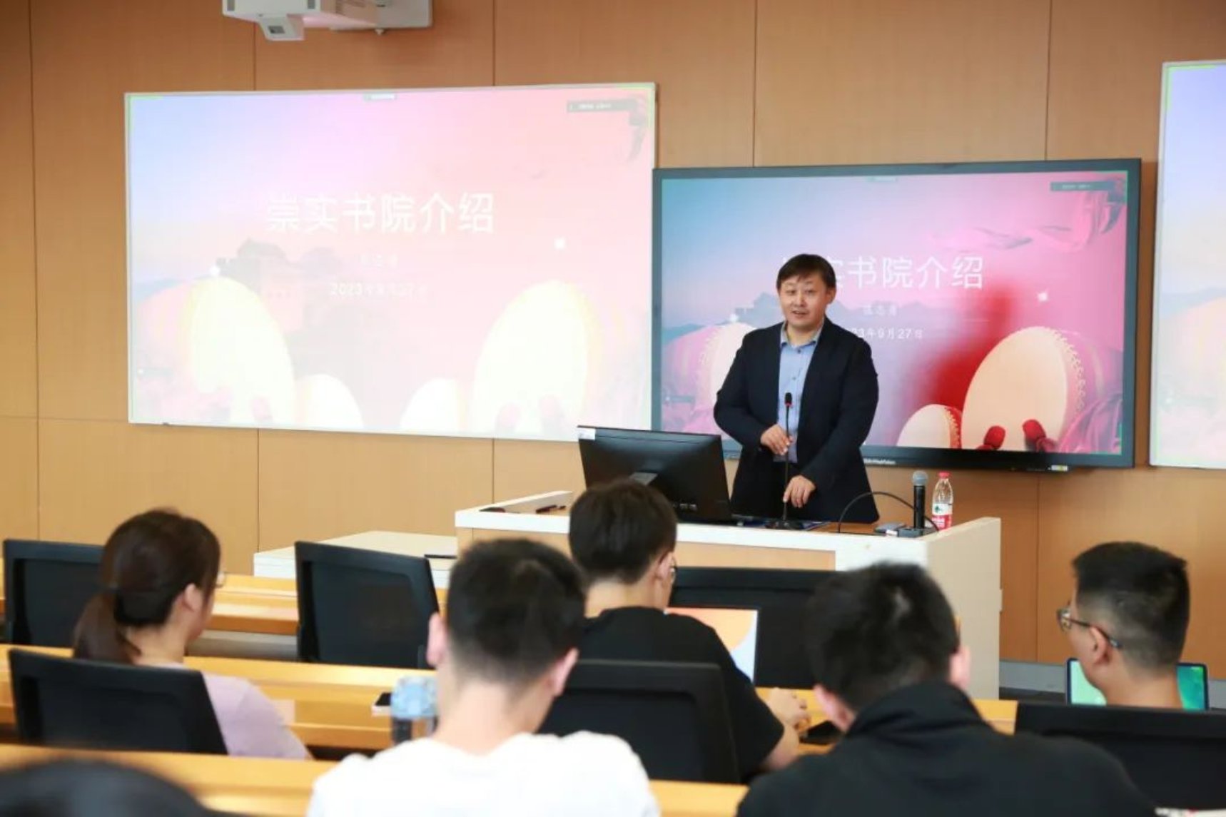 崇实书院副院长、经济学院教授范志勇为在场的本科新生介绍了崇实书院培养体系与组织架构,说明了部类共同课各类课程情况与选课遵循规则,对部类共同课进行了详细解析。