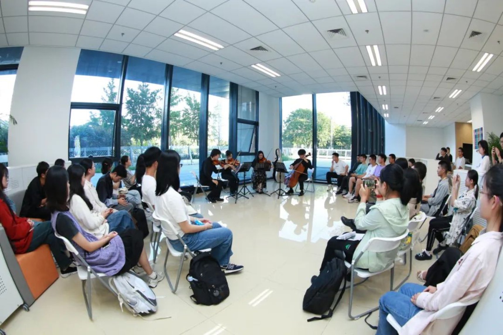 9月27日下午辩论赛决赛落幕后,明德音乐会在书院学生社区举行。来自艺术学院的均衡四重奏乐团现场讲解与演奏了名家经典作品,带领同学们认识弦乐四重奏。“这就是大学应有的样子。”一位刚从立德楼下课的同学站在一旁欣赏说。“请问下一次活动什么时候举办?”“我喜欢乐器,可以来书院社区练习吗?”现场同学不断提出关心的话题。