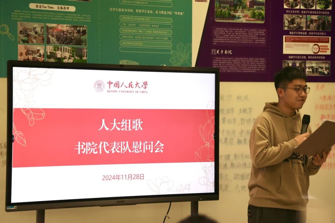 本次慰问会由书院学生服务与发展联合会综合事务中心部门负责人王屹楠主持。在带训同学的指导下,同学们首先进行开声练习,齐唱曲目《毕业上前线》,展现了一个多月刻苦训练成果。现场同时为五位参与音乐舞蹈史诗其他表演形式的同学送上了热烈的掌声,感谢他们的辛勤付出。