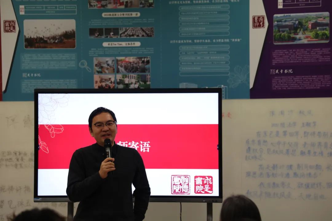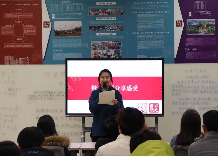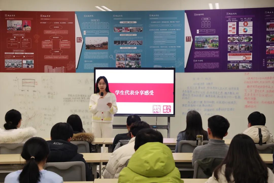 书院代表队领队张力源回顾了自己去年参与“人大组歌”合唱训练的宝贵经历,讲述了今年以领队身份参与合唱训练的新体验和感悟。在分享的最后,张力源向所有参赛的同学、辛勤指导的带训同学以及默默付出的后勤人员表达了她的诚挚感谢,感谢他们为合唱训练所做出的贡献和努力。