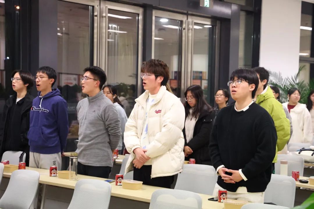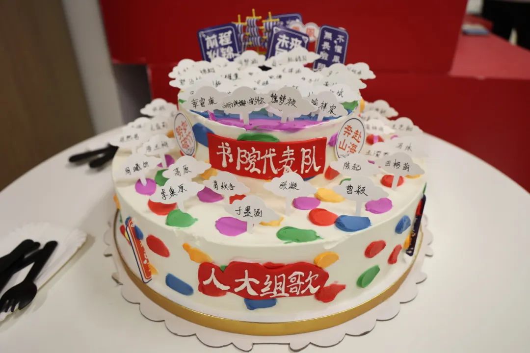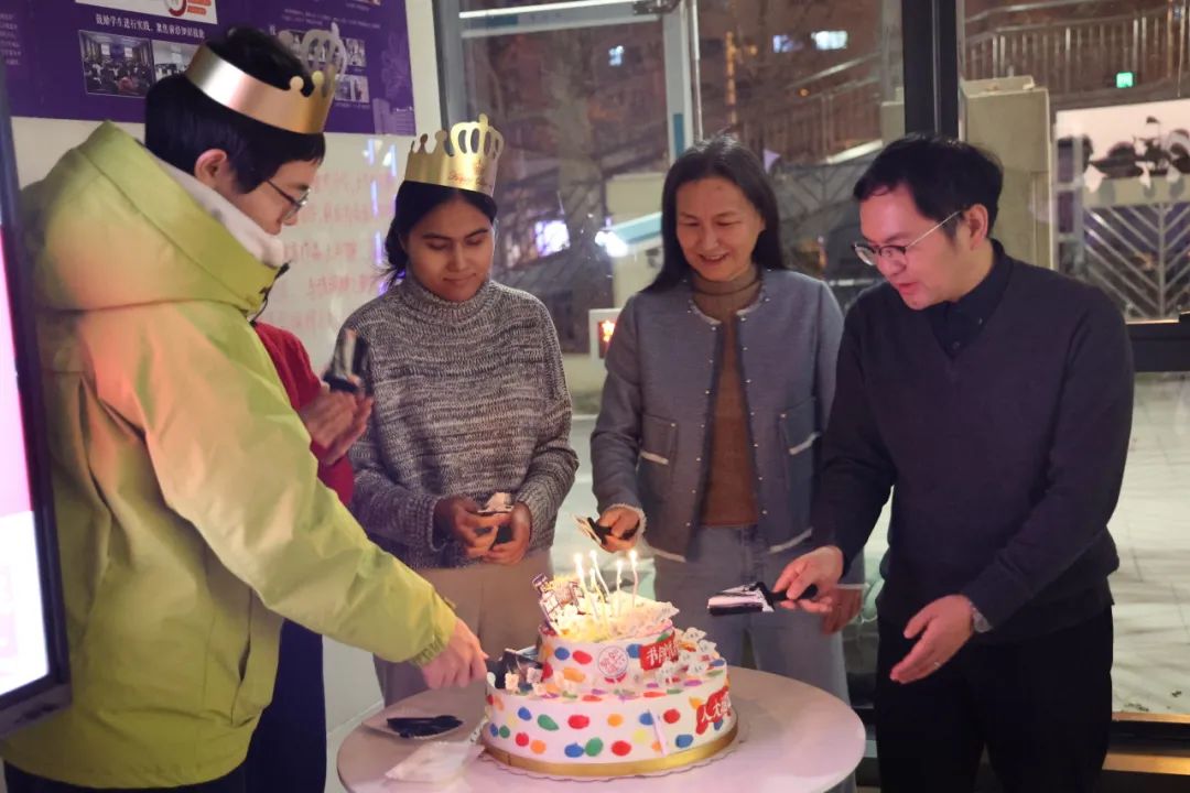 在师长寄语之后,慰问会迎来了生日祝福环节。书院特别为11月生日的古丽伊娜·安外尔、章睿康和魏梦祯举办了一场热情洋溢的生日会。在生日歌的欢快旋律下,蒙彬老师、华建光老师与三位同学一起切下了生日蛋糕,同学们一起大声唱响了生日歌为他们庆生。同时书院也为全体合唱队员准备了鲜美的果切和独一无二的定制饮品,使得整个会场充满了欢乐与温馨的气氛。笑声与掌声交织,每个人的脸上都洋溢着幸福的笑容。