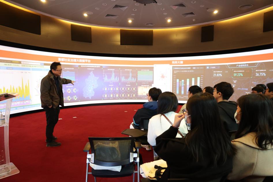 集中宣讲结束后,部分同学前往公共政策实验室。秦波老师介绍了实验室的发展历程和硬件架构,以及利用大数据助力公共研究、服务社会的成果,同学们通过首都社区治理大数据平台、时事探针、税务大脑等科研项目体会到大数据、机器学习等前沿技术带来的研究便利;老师还介绍了虚拟仿真沉浸式教学、数据挖掘探索式教学等新型教学模式。