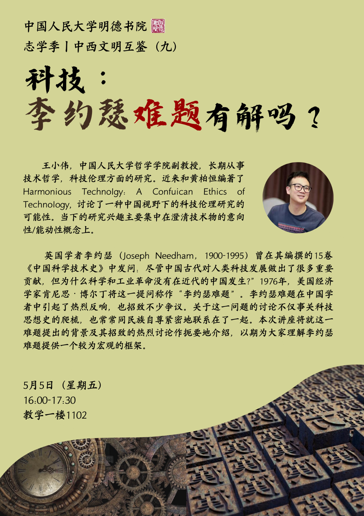 英国学者李约瑟(Joseph Needham,1900-1995)曾在其编撰的15卷《中国科学技术史》中发问:尽管中国古代对人类科技发展做出了很多重要贡献,但为什么科学和工业革命没有在近代的中国发生?”1976年,美国经济学家肯尼思·博尔丁将这一提问称作“李约瑟难题”。李约瑟难题在中国学者中引起了热烈反响,也招致不少争议。关于这一问题的讨论不仅事关科技思想史的爬梳,也常常同民族自尊紧密地联系在了一起。本次讲座将就这一难题提出的背景及其招致的热烈讨论作扼要地介绍,以期为大家理解李约瑟难题提供一个较为宏观的框架。