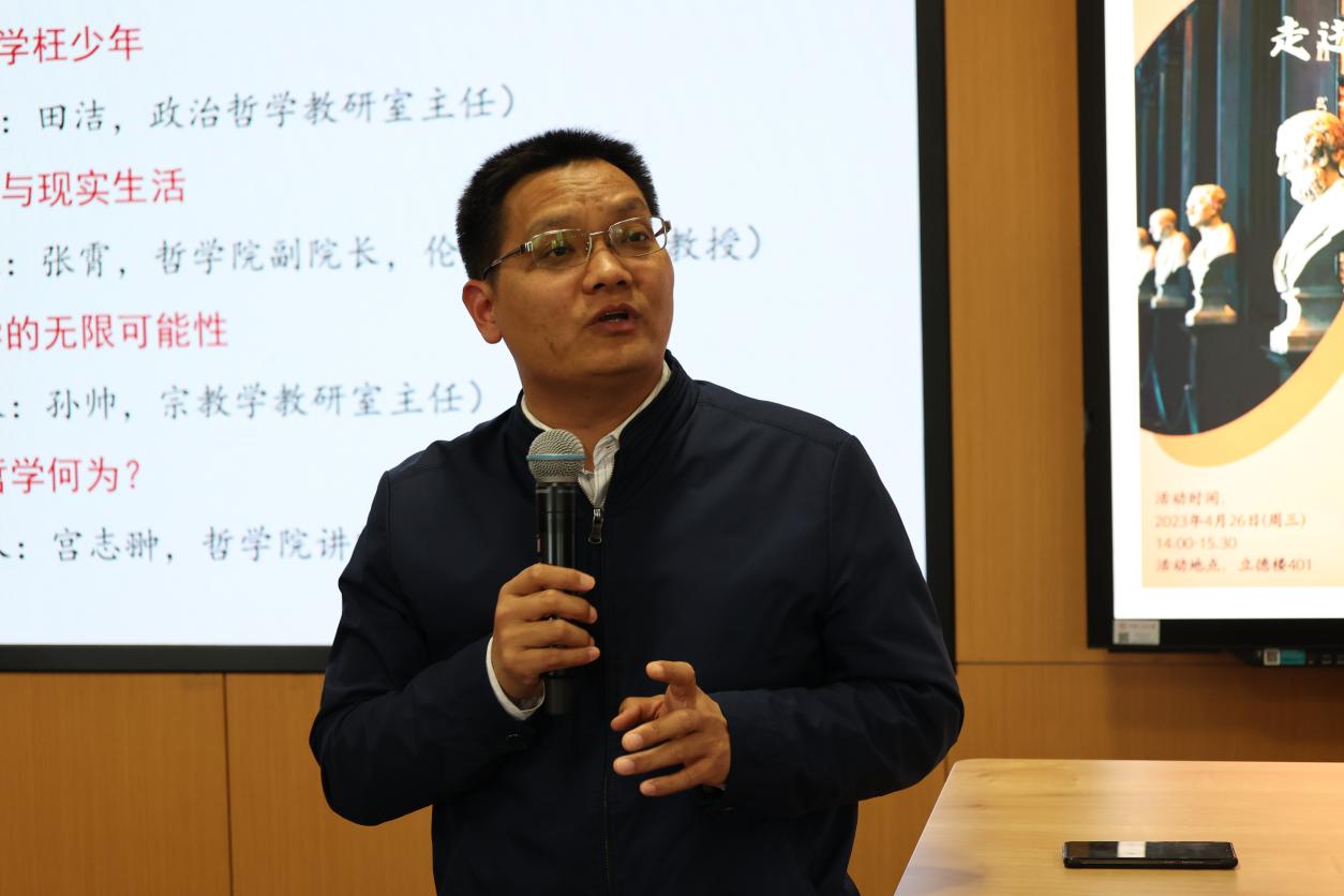 宫志翀老师对政治哲学进行了介绍,老师从中希政治哲学的开端讲起,展示了政治哲学发展的历史并摆明了政治哲学在哲学谱系中的位置,进而将政治哲学的使命概括为“理解人”和“理解政治”两条。老师通过儒家人性争论中的植物类比的例子,引导同学们思考人性与政治的关系,提出“政治应该随顺、矫治还是成就人性?”的问题,政治哲学对人和政治的兼顾使其对问题的解答不会轻率选择,凡事均需审慎权衡。