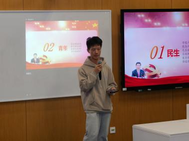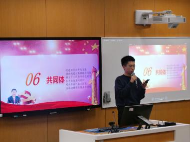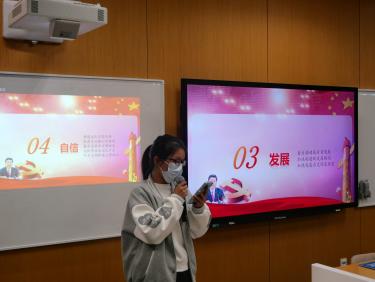 梁艺馨首先介绍了中国共产党第二十次全国代表大会召开的总体情况和两个支部成员前期学习情况。随后,两个支部成员分别围绕“民生”“自信”“发展”“青年”“创新”“共同体”六个关键词展开小组交流讨论。在展示环节,六个小组分别围绕本组关键词,结合理论学习感悟和个人生活体验,从多个角度多个方面展示了本组学习讨论的成果。