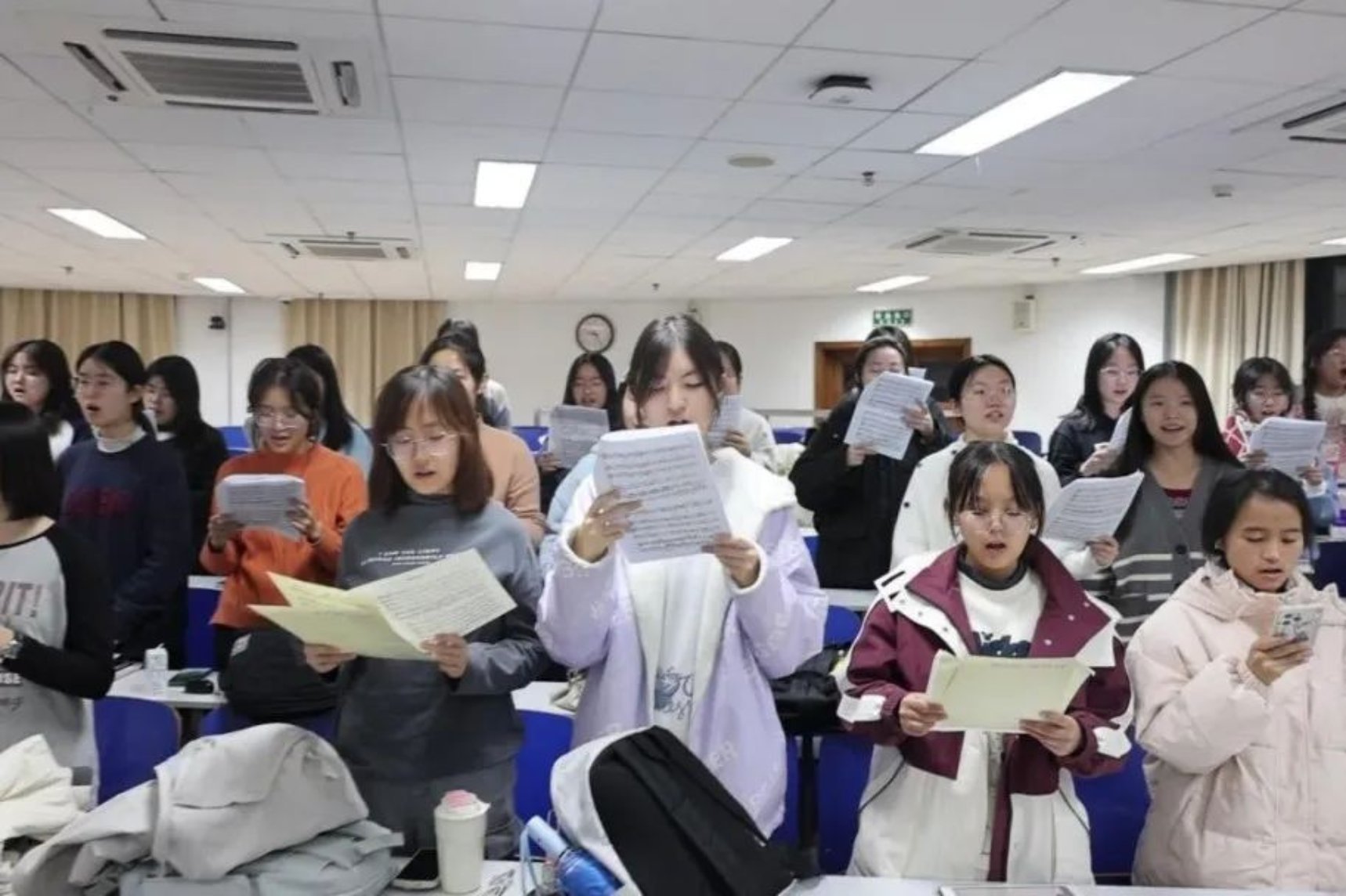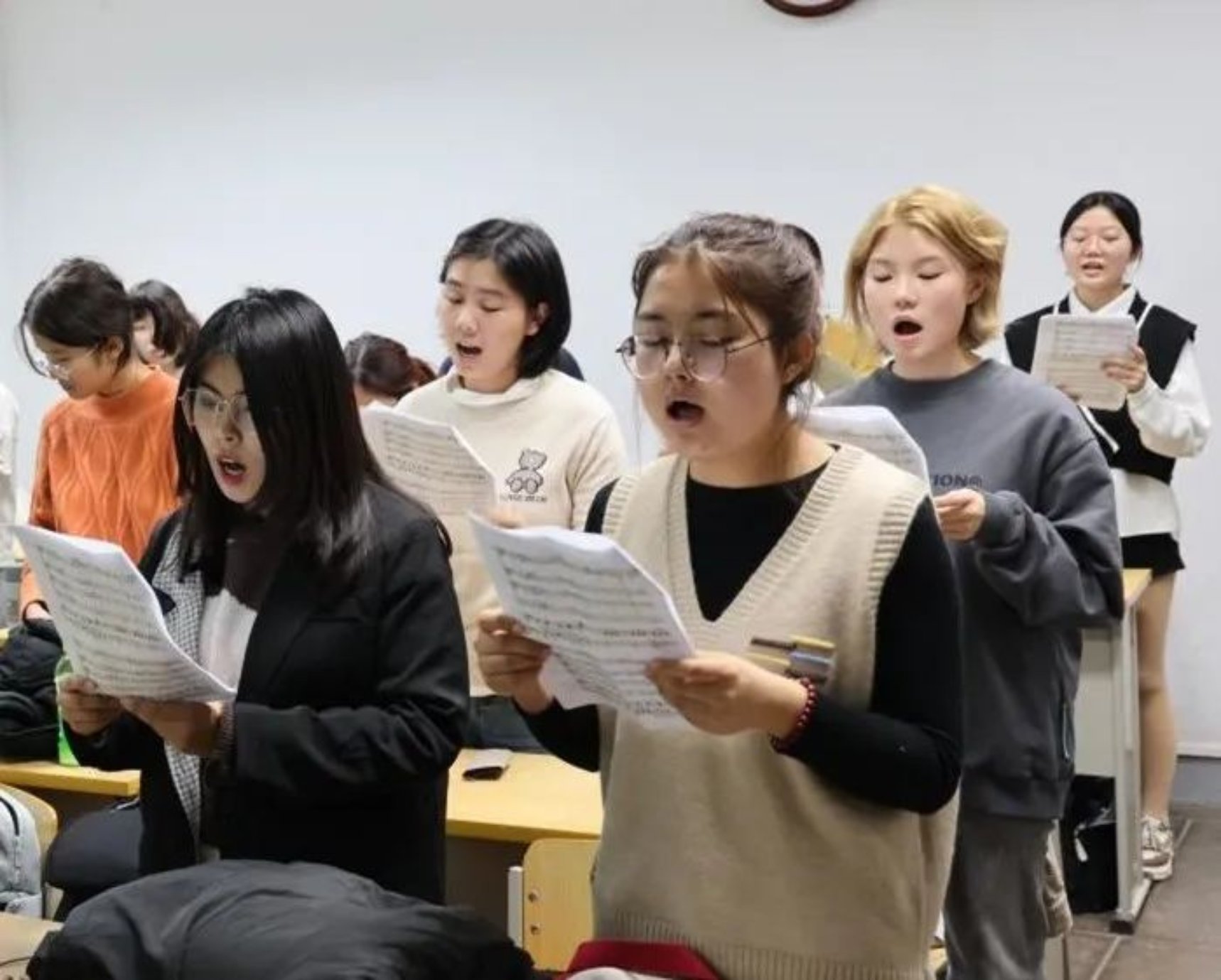 无数个无星之夜里,《英雄赞歌》的歌声在教室里回响,传颂着抗美援朝先辈们舍生忘死的精神和抗敌不息的气魄。“为什么战旗美如画,英雄的鲜血染红了它”,在一遍遍唱响这首歌、一遍遍触摸这段曲谱、一遍遍朗读这句歌词的过程中,抗美援朝精神也穿过歌声的回响,流淌进我们心间。排练合唱过程中,各位师兄师姐、声部长同学的认真负责和悉心指导让大家获得了很大进步,同学们也认真排练,团结合作,共同进步。