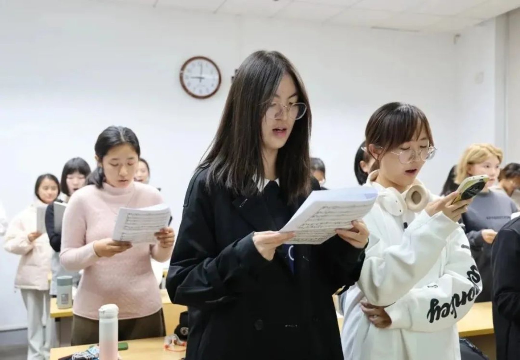 在最近两次合唱排练中,在声部长和指导师姐的带领下,同学们先后熟悉了这首歌曲的节拍、旋律、歌词,并且在反复尝试与聆听中找到了一些小错误并予以纠正。现在,同学们已经能流利地唱完这首歌。但是如何稳定气息、如何轻松唱准高音仍是同学们需要克服的困难。