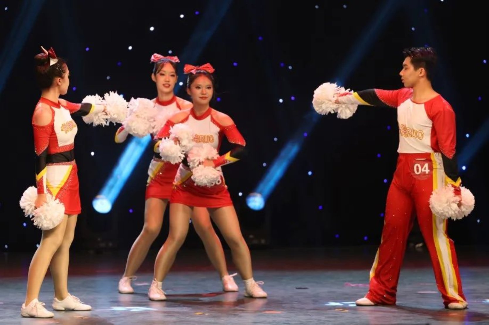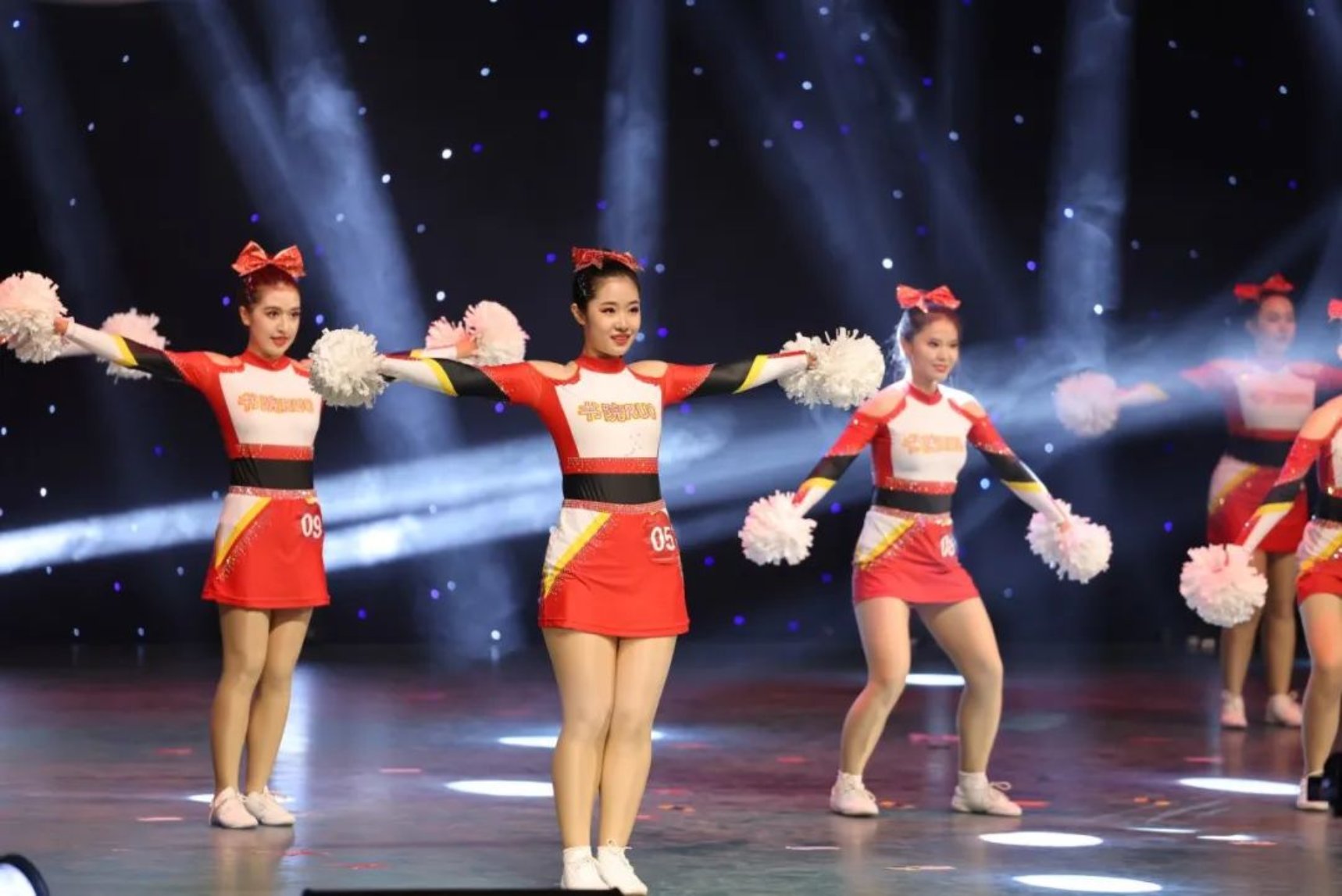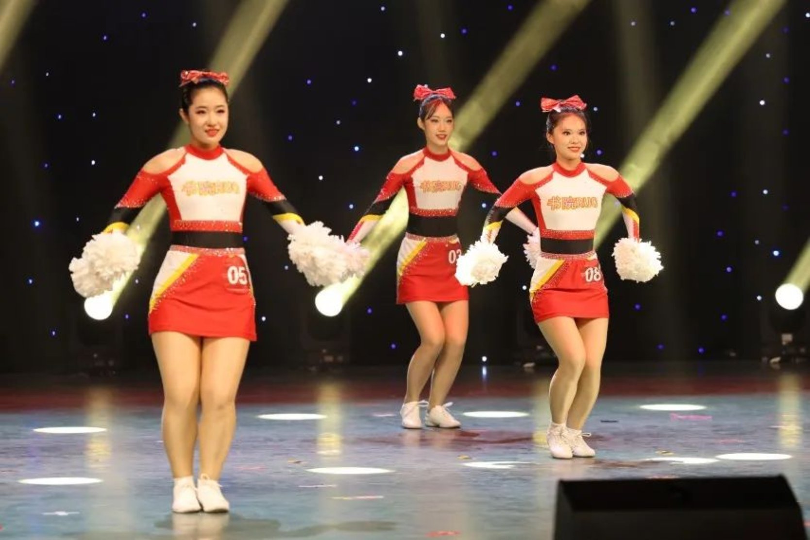 19:25,书院健美操队闪亮登场。红色为主色调的队服搭配白色花球,队员们在如昼的灯光下熠熠闪耀,整装待发!