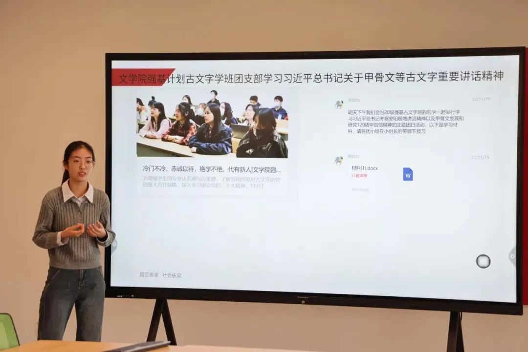 文学院2021级强基计划古文字学班(团支部)在学校2024年度先进班团集体评选中获评为十佳班集体(红旗团支部)。团支部书记薛路怡为书院2024级班团骨干分享班团建设经验。她表示,班团建设工作需始终秉持为同学服务的根本宗旨,以增强班团凝聚力、提升同学获得感为目标,构建职责明确、运转高效的班团组织架构,形成协同联动、责任到人的工作机制。要注重形式创新与内容充实相结合,强化活动教育性、参与性和实践性,同步做好活动成果的规范化存档与多维度宣传,确保工作成果可追溯、可展示。要注重挖掘具有标识性、传承性的文化符号,构建特色鲜明的班团品牌形象。