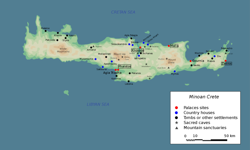 米诺斯文明上承自基克拉泽斯文明,下接迈锡尼文明,是青铜时代爱琴海文明的代表,也是欧洲本土文明的最早起点之一。米诺斯文明以众多规模庞大的“宫殿式”定居点而著称,这些定居点以“宫殿”为中心,既没有防卫性的城墙,也没有发掘出墓葬和武器遗存,这些都为米诺斯文明添上了神秘色彩,后世部分学者认为这是因为克里特作为海岛相对闭塞、主要防卫在海上而非陆上。