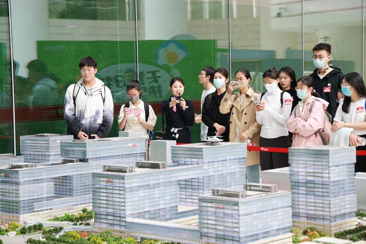 到达位于通州区科创十一街的京东集团总部之后,师生代表首先跟随讲解员陆续参观了京东集团各主要业务部门的展区,具体包括京东集团的线下人工服务与智能快递柜相结合的物流自提点、京东之家、京东物流、京东保险、京东总部建设模型等板块。
