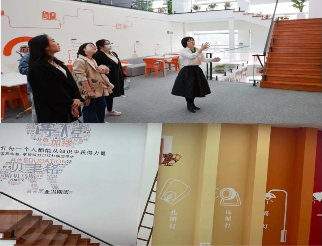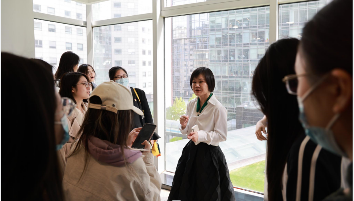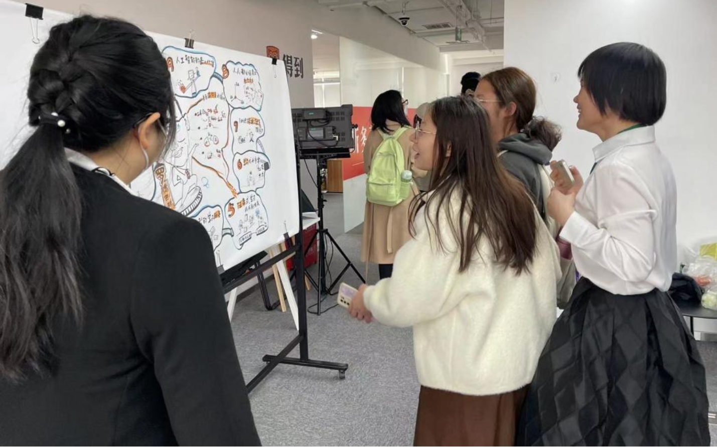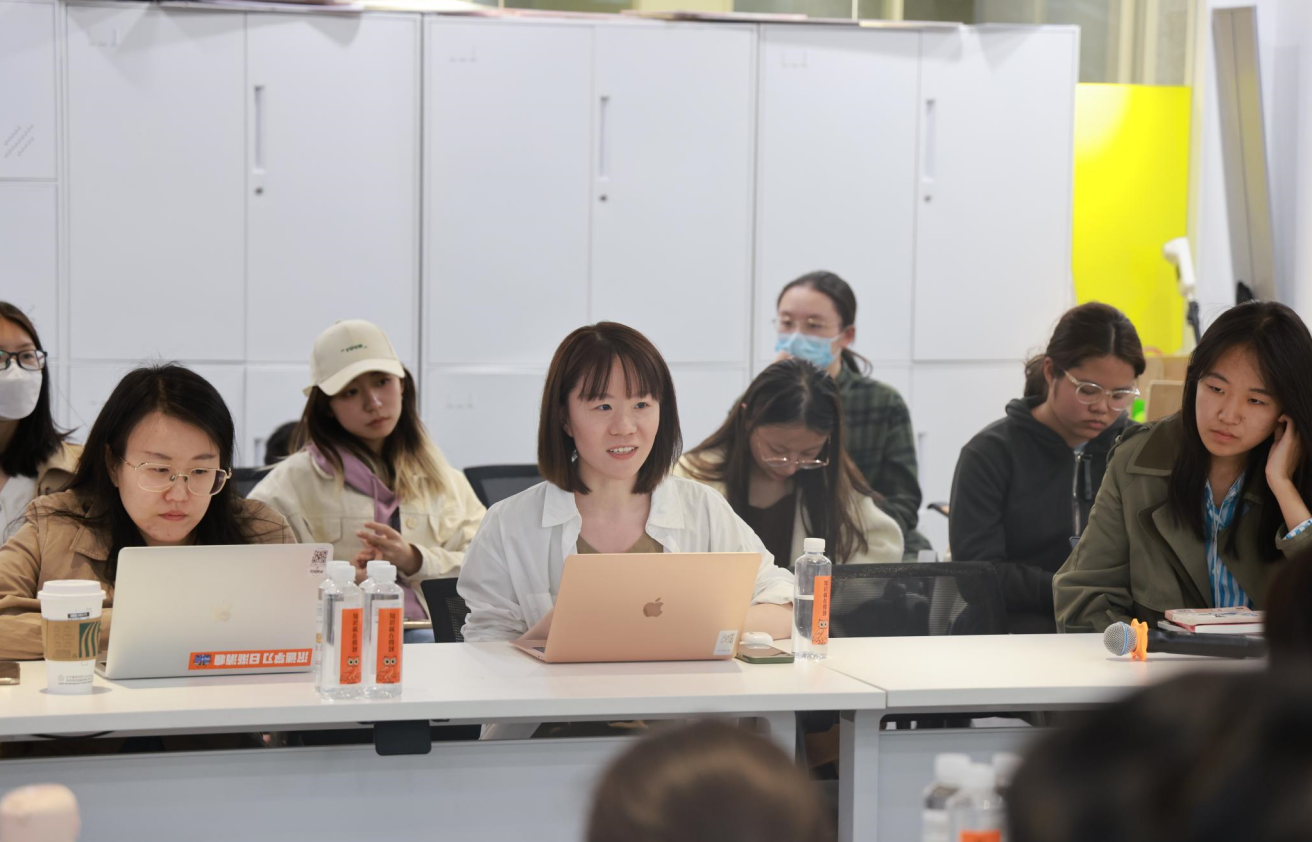 随后同学们来到五楼的研发部,这里与其它部门的氛围稍有不同,充斥着简洁的科技感与秩序感。大白板上画着漫画式的思维导图,指导着员工工作;移动大屏上显示着实时数据,正进行高速精准的计算。冯启娜老师透露,公司内部已经在常态化地使用Chat-GPT了,当前技术变革之日新月异、时不我待。七楼的策划部的公共空间的的陈设赏心悦目,休息区、母婴室、咖啡厅彰显着浓厚的人文关怀。
