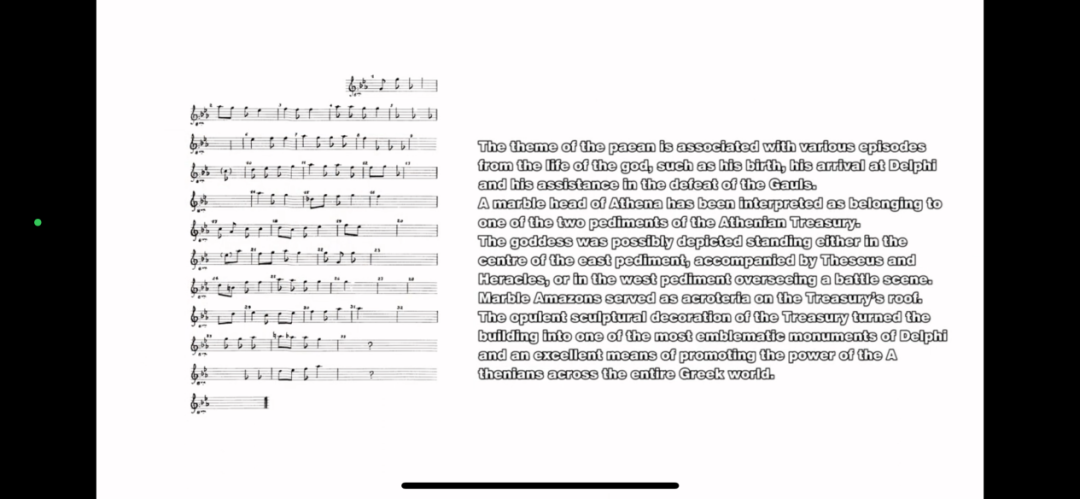 德尔斐博物馆展示出了古希腊“阿波罗颂(Hymn of Apollo)”乐谱的石碑,德尔斐考古博物馆的数字App上提供了该旋律转换成现代五线谱的乐谱,我在当场就哼唱了出来,也讶异于古希腊能够出现一种独特的记谱语言。这或许是最早的记谱体系,有待考证。