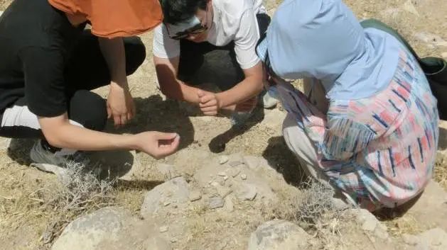 距离阿尔达希尔宫殿几公里处即菲鲁巴扎德平原上最重要的萨珊古迹——库雷(Gor)古城。从地表上看,现在已经无法看出这里原来作为一座城市所建造的城墙和和沟渠的痕迹;但在卫星影像上,城墙与环壕的圆形轮廓还清晰可辨。古城中心,一座高高的方塔矗立在平原上,远远就能够看到。在文献中,这座方塔被称为“tirbal”。德国考古学家恩斯特·赫茨菲尔德首次认识到了这座方塔作为军事建筑的真实性质;同时,这座城的规划和建造也是以这座中心塔为基础,以维持相同的建造半径,体现了萨珊时期的测量技术已达到了较高的水平。如今这座方塔损毁严重,修复的痕迹清晰可见。王子奇老师以此为例向大家解释了文物建筑保护和修复工作中的“可逆性原则”,即要保证文物建筑修复过程中的各种手段,包括支撑物、附加物,都应该是可判明和可去除。在古塔以南的城区部分,脚下的石块堆砌成方形,不远处裸露的石块也是整齐的立方体,揭露了这里过去曾是庞大的建筑群。地上随处散落着碎陶片,部分碎陶片上保留着釉和纹饰,研学团师生们仔细观察了这些碎陶片,并惊喜地发现了其中还有来自中国的瓷器碎片。