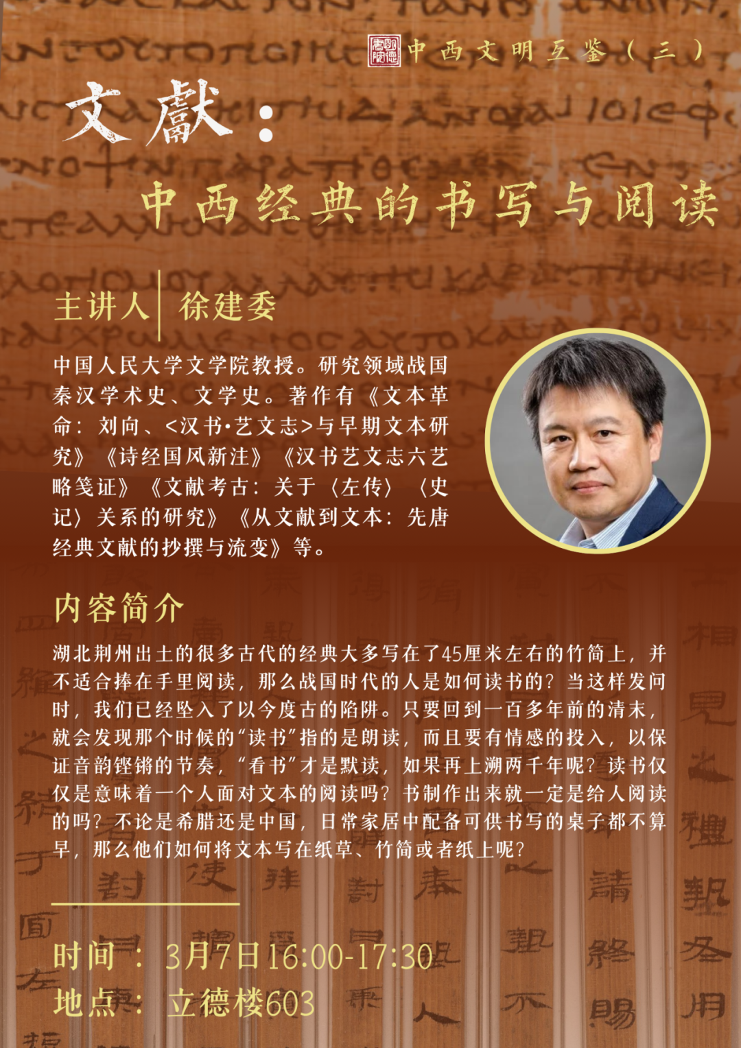 在本课程的第三讲中,我们将与徐建委老师一起重溯文明的密码,理解中外经典的诞生与传承,感受书写与阅读的交织中绵延不息的生命力。