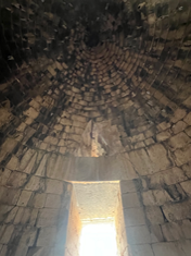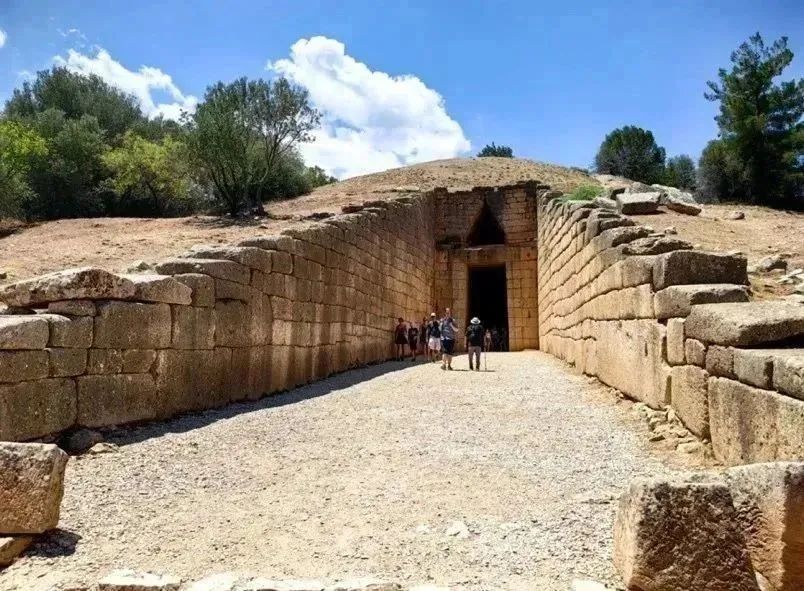 随后,研学团一行来到了“阿特柔斯的宝库”(Treasury of Atreus,也称为“阿伽门农之墓”)。这是一座大型的蜂巢状坟墓,主墓由一个圆形墓室组成,顶部有一个拱形圆顶。它大约建于公元前1400年到公元前1200年间,是现存的迈锡尼时代建造的最大、最精致的托洛斯陵墓(tholos tomb)。该陵墓于19世纪首次被挖掘,并被当时的学者看作是由迈锡尼统治者所造,且有可能埋葬着完成建造堡垒的君主或其继承人的遗体,因此,首位挖掘者施里曼将其命名为“阿特柔斯的宝库”。然而,在20世纪,随着挖掘工程的不断推进,另有学者提出,该坟墓的历史或许早于《荷马史诗》中所描述的英雄时代。时至今日,该陵墓的具体建造时期仍然是考古学界争议不休的难题。