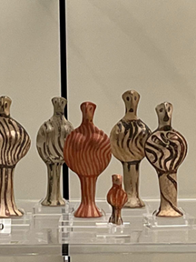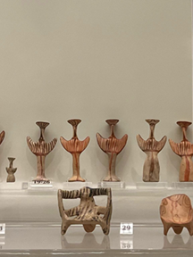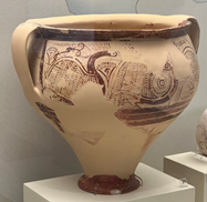 研学团首先前往迈锡尼考古博物馆。该馆收藏了约2500件展品,主要为迈锡尼地区出土的来自公元前3000年至公元前2世纪的陶瓷、金银首饰、壁画等。馆内有三个主要展厅。第一个展厅以迈锡尼出土的陶器为主。这些陶器大部分由黏土在高温下烧制而成,呈现出黄褐色或红褐色的斑驳表面,彩绘与单色并存。它们多以双耳瓶(罐)、梨形或圆柱形的马镫罐(Stirrup Jar)为主,形状相较克里特文明时期更为多样,装饰风格延续了克里特人对于流动性与生命力的喜爱,以展现海洋生物、植物和日常生活为主。这些陶器主要用于储存、运输、烹饪和祭祀活动,其中一些制作精美的陶器也成为了权威的象征,并参与进了地中海沿岸广泛的贸易之中。展厅中还陈列了一些陶制的Psi-type和Phi-type的人像雕塑(这两个名字是因为它们造型酷似希腊字母ψ和Φ),它们不过10厘米上下,抽象地捏塑成人的形状,上面用红色或黑色的颜料画出服饰的花纹,这些人形的用途至今依然没有定论。