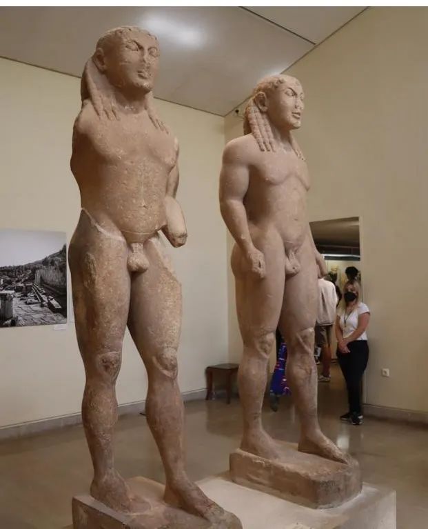 研学团首先来到了德尔菲考古博物馆,其中最引人注目的莫过于大厅中央的一对大理石人像。这是公元前 580 年阿尔戈斯古老作坊的作品,是德尔菲发现的最古老的纪念性祭品。这组雕像具有典型的伯罗奔尼撒风格,体型庞大,肌肉发达,左脚向前迈出,双手弯曲肘部,触摸大腿,双手握拳。头发卷曲,垂在肩前。眼睛呈杏仁状,眉毛高挑,带着典型的古代微笑,肃穆深邃,庄严神秘。