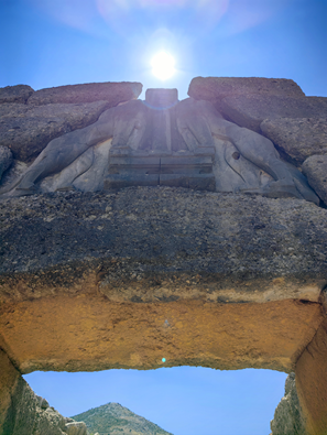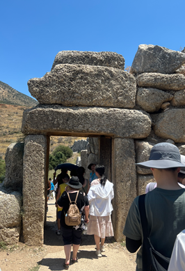 在参观了迈锡尼考古博物馆,对迈锡尼古城有了初步的认识之后,研学团前往参观迈锡尼遗址。顺着山路向上,绕过王后墓葬坑,雄伟的“狮子门”(The Lion Gate)映入眼帘。狮子门的门楹上雄踞着两只巨大的石狮,门两侧宽厚的城墙构成了一个“凹”字,使得该地易守难攻。
