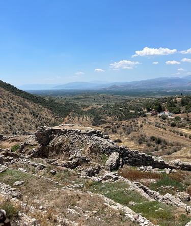 从迈锡尼王宫沿小径下山,可以看到更多小屋的遗存与山景。研学团穿过了迈锡尼城西侧的一个小门。在一些传说中,阿伽门农的儿子俄瑞斯忒斯(Orestes)在父亲被害后便是从这里逃出迈锡尼的,之后向母亲复仇时也是通过这扇小门回到家乡。