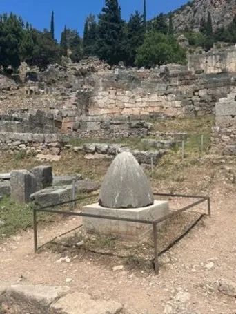 参观完德尔菲博物馆后,研学团一行人便到后山阿波罗神庙遗址参观,按古老的之字形路线沿路上山。祭祀山上大部分雕塑已被收入博物馆,山上依稀可见部分残余石柱、石阶和地基。在之字形圣道的第一个转角,便是德尔菲“世界的肚脐”(Omphalos)的所在地。相传宙斯为了确定世界的中心,在世界的两端各放了一只神鹰,让它们同时朝中间飞,最终这两只鹰便在德尔菲相遇,宙斯因此在此处放置了这块石头。如今在此的石块只是标识位置,真迹则被存放于德尔菲考古博物馆中。