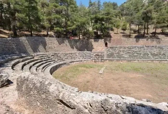 从神庙往上走,便来到了德尔菲的剧场。在古希腊人的观念中,戏剧表演乃是祭祀活动的一部分。这一剧场始建于公元前4世纪,其后多次修缮,最终在公元67年尼禄皇帝到来时建造成现在的样子。剧场的观众席能够容纳大致4500名观众。