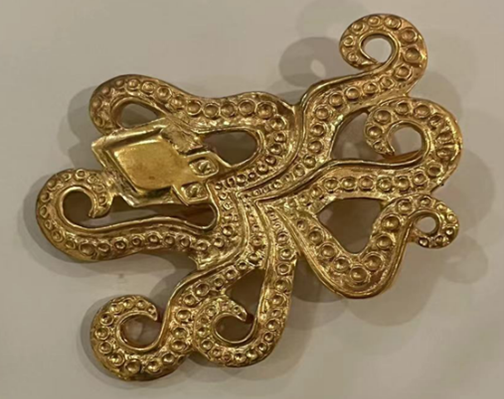 第二个展厅以死亡与地下世界为主题,展示了从墓葬中出土的金器、首饰等,其中最有趣的是展柜中一对金色的章鱼形状的装饰,其样式仿佛克苏鲁神话中的古神,古今审美在这一刻展现出一种奇妙的类似。