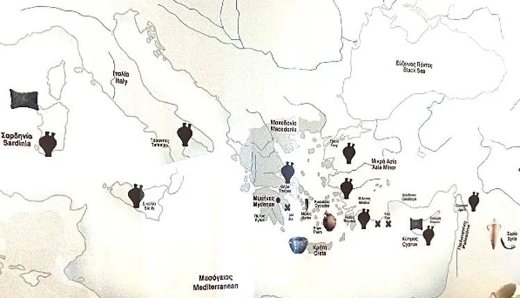 第三个展厅展出了迈锡尼人从事狩猎、贸易、祭祀、装扮等活动的用具,呈现了他们日常生活的方方面面。一些刻有迈锡尼时期的数字与文字符号的泥版格外引人注目,它们作为“账本”记录着几千年前的琐碎日常。博物馆中还陈列着一块展板,其上展示了世界上各个文明在陶器器型上的相似之处,通过比较相似器型在世界地图上的分布,我们很容易观察到文明之间交流借鉴的痕迹。