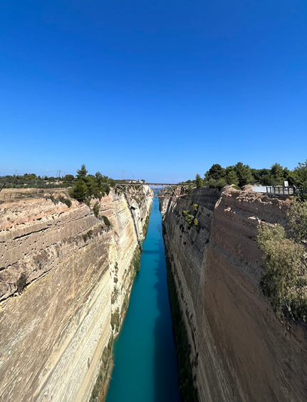 7月7日,在前往迈锡尼的路上,研学团经过了全世界修建时间最长的一条运河:科林斯运河(Corinth Canal)。这条运河的修建最早可以追溯到公元1世纪罗马皇帝尼禄时代,而直到1893年工程才正式竣工,中间跨越了长达1800多年。这条运河位于科林斯地峡(Isthmus of Corinth),连通了爱奥尼亚海的科林斯湾(Gulf of Corinth)与爱琴海的萨罗尼克湾(Saronic Gulf),并将伯罗奔尼撒半岛与希腊大陆分离开来。运河全长6343米,岩壁高达90米,近乎笔直,运河内水深8米,水面宽度仅有24.6米,较大船只通过运河时,往往需要拖船的牵引。