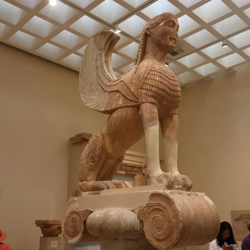另一个吸引研学团驻足的是著名的斯芬克斯狮身人面像,这尊雕像可追溯至公元前560年,是希腊对拥有狮身、鸟翼和女人头的斯芬克斯最早的艺术表现之一。斯芬克斯因为与俄狄浦斯家族的悲剧密切相关而广为人知。