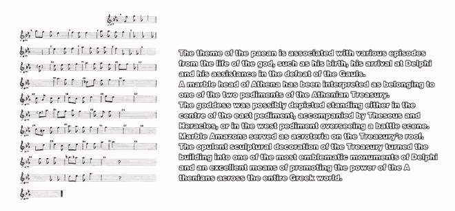 博物馆中一件特别的展品引起了大家的注意。在一块并不起眼的大理石碑上,刻有古希腊乐谱的“阿波罗颂歌” (Hymn to Apollo)。值得注意的是,彼时距离中世纪的纽姆谱(即现代五线谱记谱法的前身)出现还有一千多年。幸运的是,博物馆提供了此古乐谱的现代谱例,让几千年前的旋律能够重现世间,成为古今文明沟通的特殊桥梁。