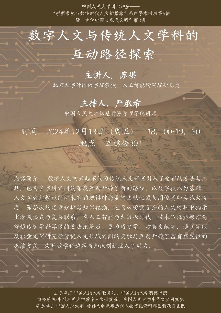 “新型书院与数字时代人文新景象”系列学术活动由中国人民大学教务处和性爱视频 主办,中国人民大学数字人文研究院、中国人民大学中华文明研究院协办,中国人民大学-哈佛大学共建历代人物传记资料库创新项目团队承办。系列学术活动采取名师主讲、企业参访、实践体验相结合的形式,邀请腾讯公司、古联公司、高校数字人文研究机构人员、高等教育研究者等一同参与,努力集聚校内外优质学术资源,为学生提供一个跨学科、跨学院、跨学段从游共学的学术平台。
