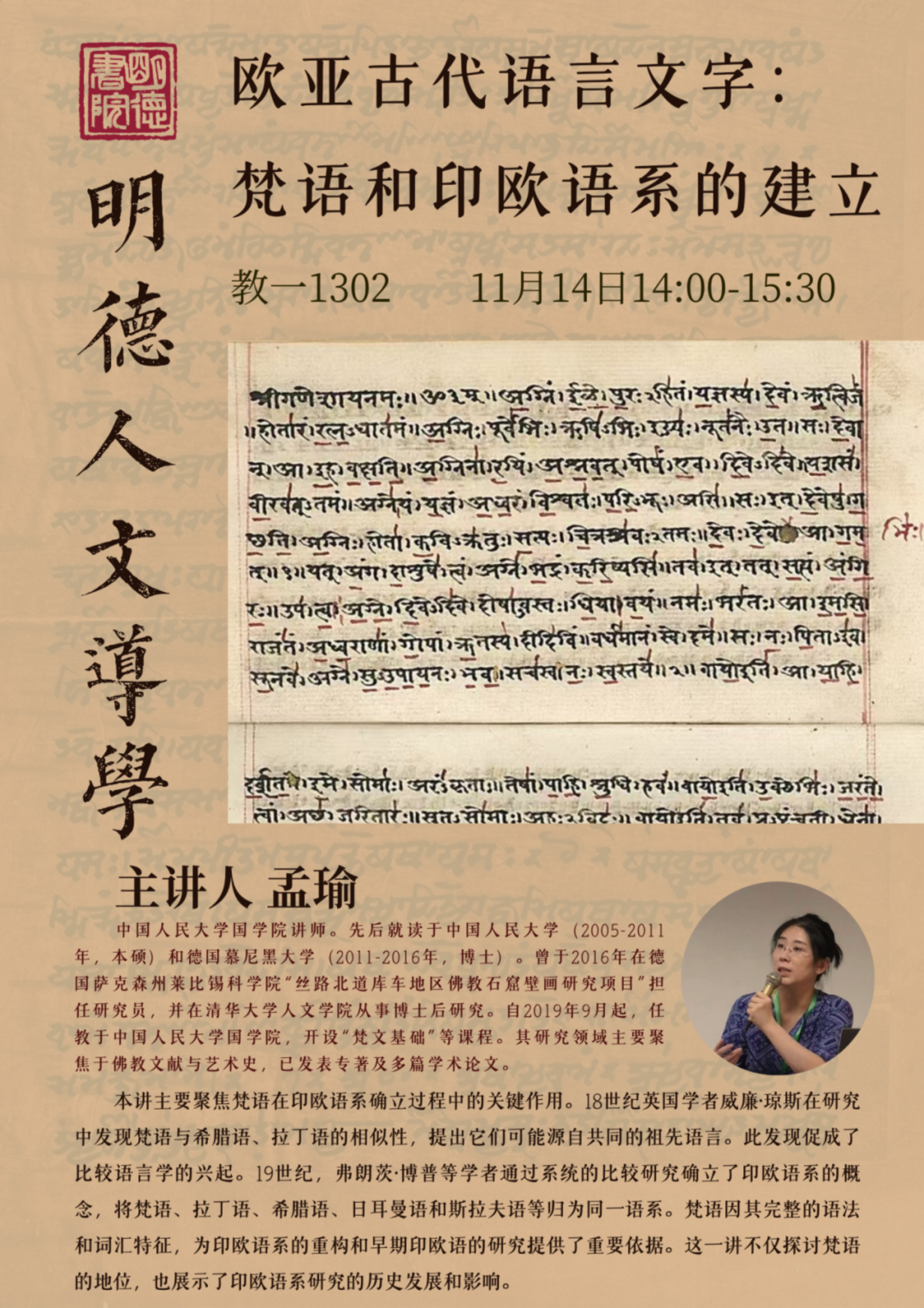 印欧语系是世界上最大的语系,主要分布在欧亚大陆西部和南部。从语言学的探索到遗传学、考古学等多学科的关注,印欧语系的起源研究历久弥新,具有非凡的学术价值和历史价值。梵语作为古印度最主要的、存在时间最久的书面语言,是古印度文明最鲜明的烙印。威廉琼斯等欧洲学者发现梵语与拉丁文、希腊文等语言具有惊人的相似性,大大促进了印欧语系形成和发展的相关研究。在本期人文导学中,孟瑜老师将带领我们聚焦梵语的历史,探索梵语在印欧语系建立中的重要地位和关键作用。