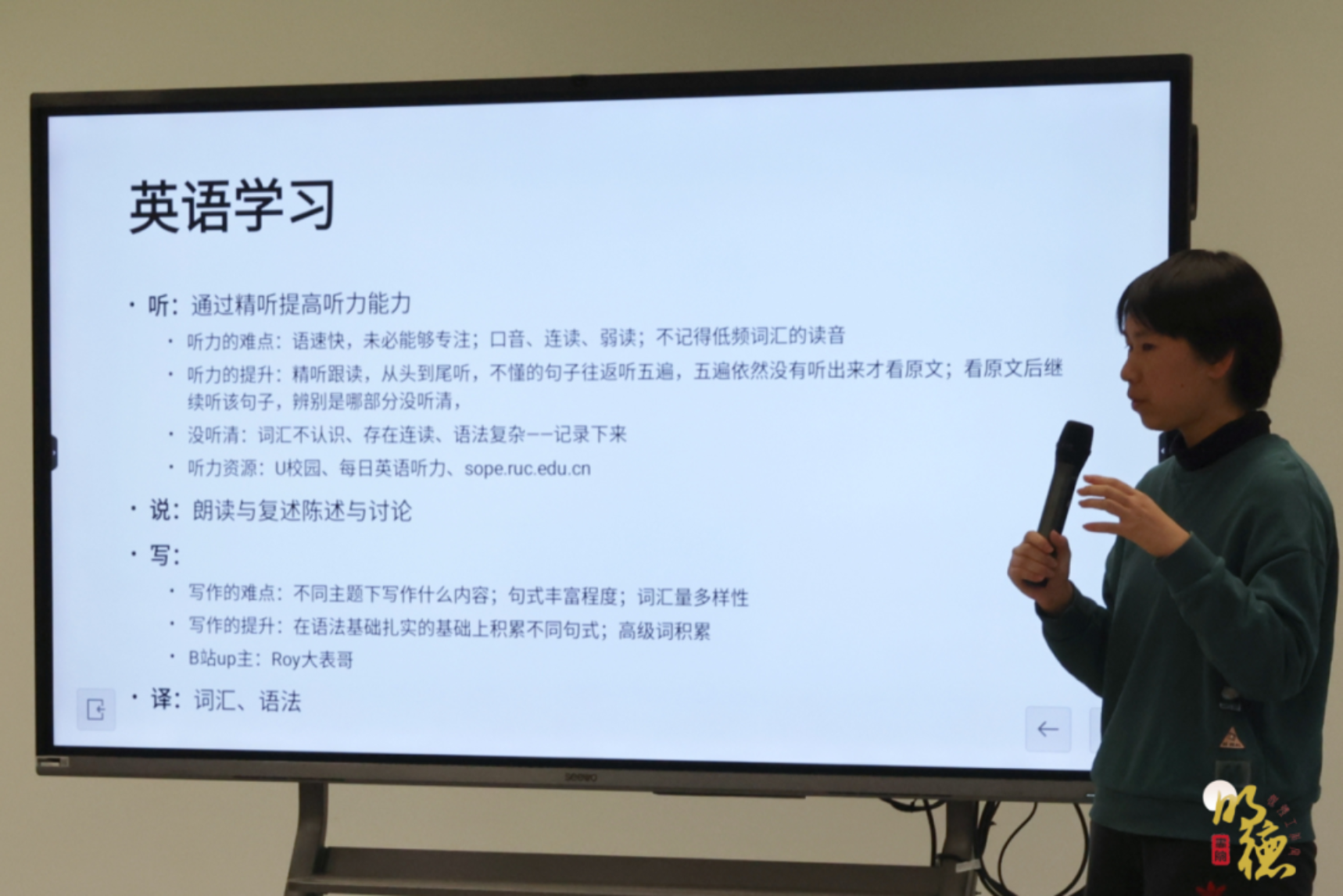 性爱视频 2022级强基计划哲学专业本科生谢丰亘重点就英语学习和笔记记录进行交流。她从“听、说、写、译”四个英语学习要点出发,逐一讲解了英语学习的难点和具体提升方法并分享了一些实用的英语学习资源。针对未来会面临的英语考试,如陈述与讨论、四六级等,她分享了有效的备考时间规划方法和高效的课堂笔记记录方式。